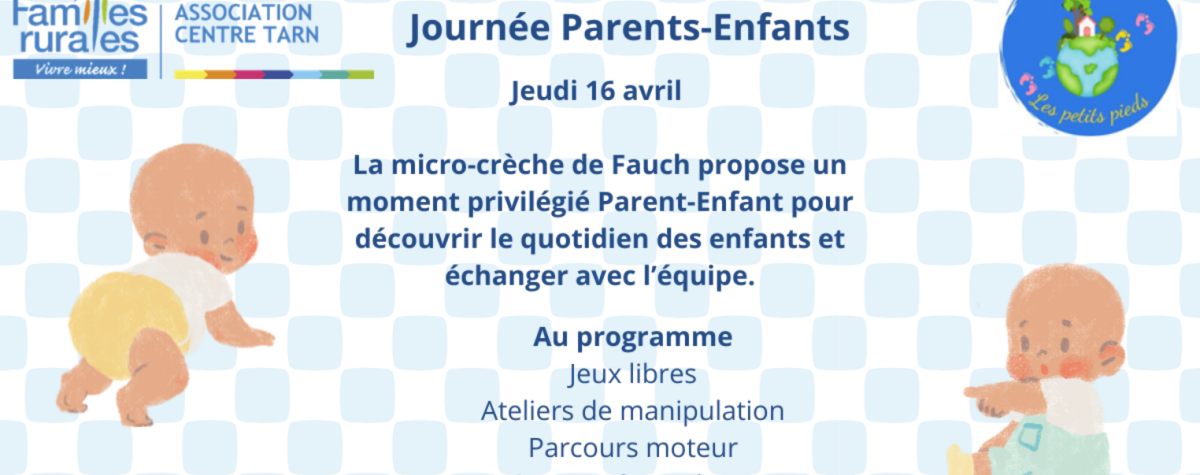 JOURNÉE PARENTS-ENFANTS La micro-crèche Les Petits Pieds à Fauch de Familles Rurales Centre Tarn, vous invite à un moment privilégié à partager avec votre enfant 💛